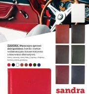 Kalendarz książkowy SANDRA - elegancka błyszcząca oprawa skóropodobna, bardzo chętnie wybierana jako konserwatywna i stonowana alternatywa. Oprawa kalendarza Sandra dobrze tłoczy się na gorąco. Do produkcji tych kalendarzy używane są bardzo wytrzymałe i miłe w dotyku włoskie materiały. Dostępne kolory: czerwony, czarny, biały, j.brązowy, c. brązowy, bordowy, zielony, granatowy.