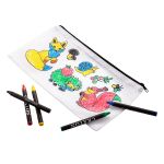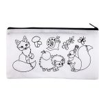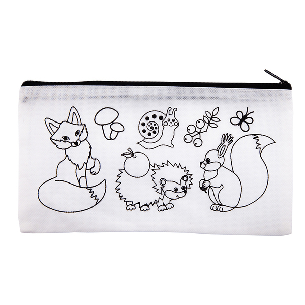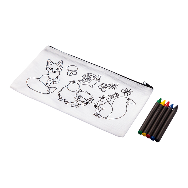 Piórnik z materiału non woven z motywem leśnych zwierzątek, do samodzielnego pokolorowania. Wyposażony w 5 kredek woskowych.