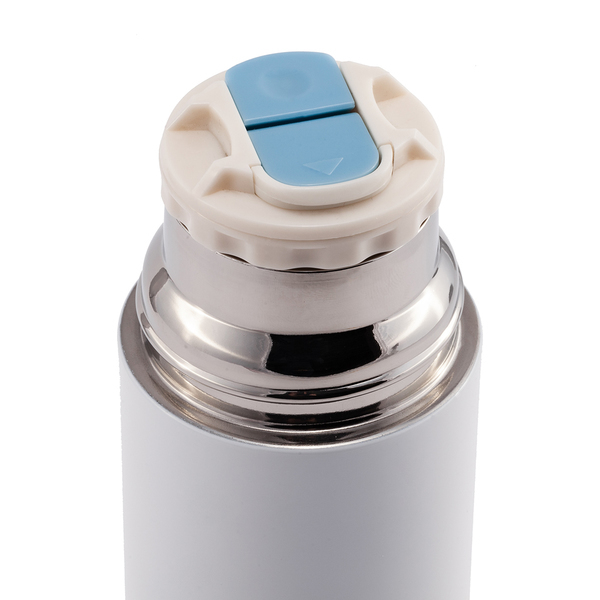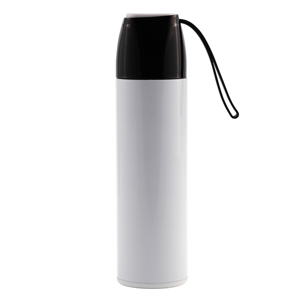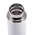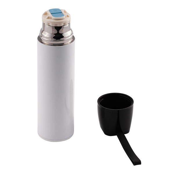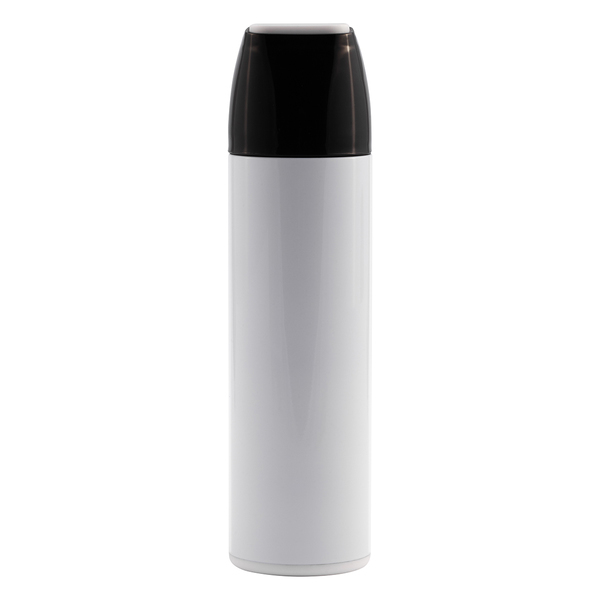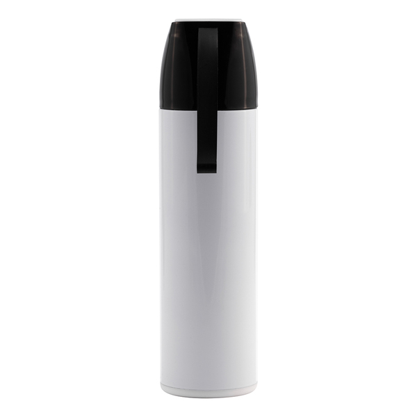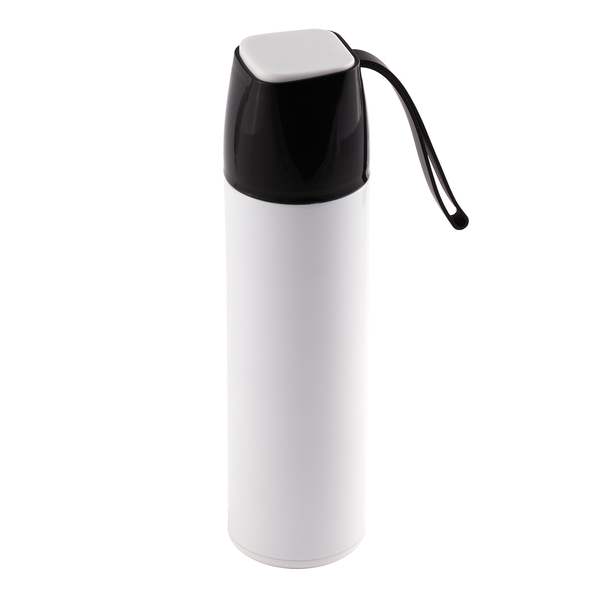 Szczelny termos próżniowy z dwiema metalowymi ściankami, o pojemności 430 ml. Wewnątrz termosu zastosowano stal nierdzewną 18/8 o podwyższonej jakości. Pokrywka rozkręca się, umożliwiając jej dokładne umycie. Elegancki design. Termos zaprojektowany jest w nowoczesnym stylu. Wyróżnia go klasyczna czerń i biel z delikatnym połyskiem. Doskonale sprawdza się w codziennym użytkowaniu, na kilkugodzinny pobyt poza domem. Przydatny zarówno zimą, jak i latem. Ergonomiczny, smukły kształt ułatwia pakowanie i trzymanie w dłoni, także tej drobniejszej, kobiecej. Nakrętka z uchwytem służy jako kubek. Pojemność kubka 75 ml.