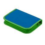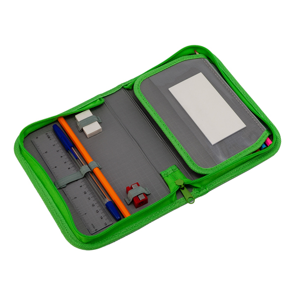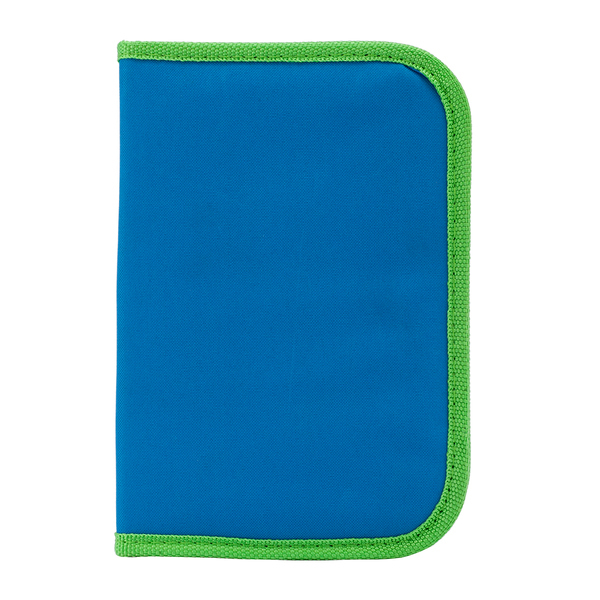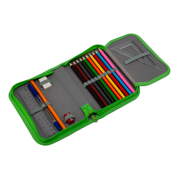 Piórnik szkolny w oprawie z poliestru 300 D. Na zestaw składa się linijka, ekierka, gumka, temperówka, ołówek, długopis, 10 kredek, dodatkowa kieszonka.