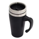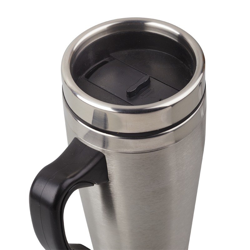 Kubek izotermiczny ze stali nierdzewnej, z poręcznym uchwytem. Pojemność 380 ml. Wewnętrzna ścianka wykonana z ulepszonej jakości stali 18/8.