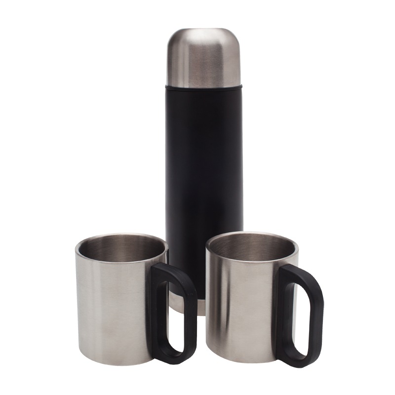 Termos próżniowy z dwiema metalowymi ściankami, dobrze trzymający ciepło. Wewnątrz termosu i kubków zastosowano stal nierdzewną 18/8 o podwyższonej jakości. Pojemność termosu 480 ml, kubków 180 ml każdy. Wymiar termos 70 x 245 x 70 mm, kubki 100 x 80 x 70 mm.