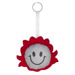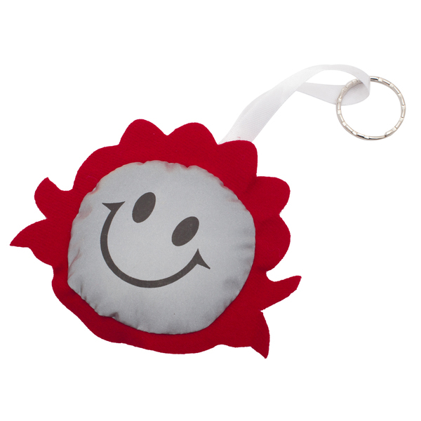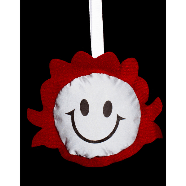 Maskotka w kształcie buzi dziewczęcej wykonana z materiału odblaskowego i filcu.