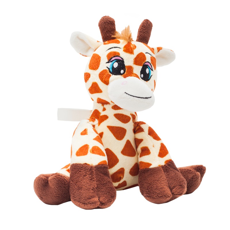 Maskotka w kształcie żyrafy, wykonana z poliestru. Wyposażona w tasiemkę z miejscem na logotyp.