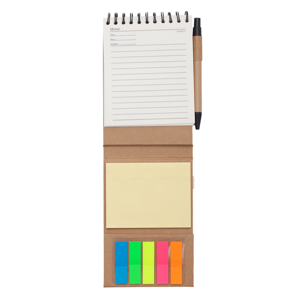 30-kartkowy kołonotatnik w kartonowej okładce o grubości 2 mm. Można go ustawić w pozycji pionowej. Gramatura papieru 80 g/m2. Zawiera 25 szt. żółtych karteczek samoprzylepnych (80 g/m2), długopis oraz foliowe zakładki indeksujące 5 x 25 szt.