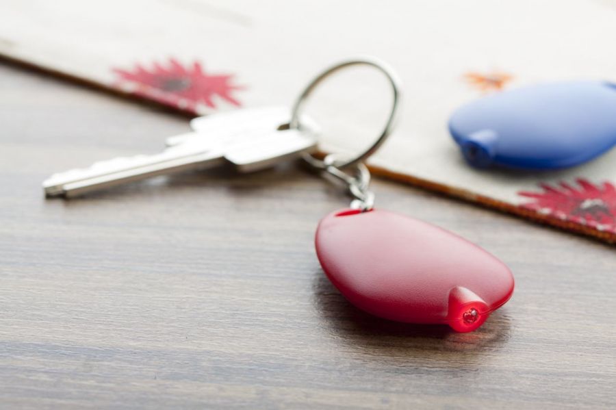 Plastikowy brelok z metalowym kółkiem na klucze , z wbudowaną czerwoną diodą led.