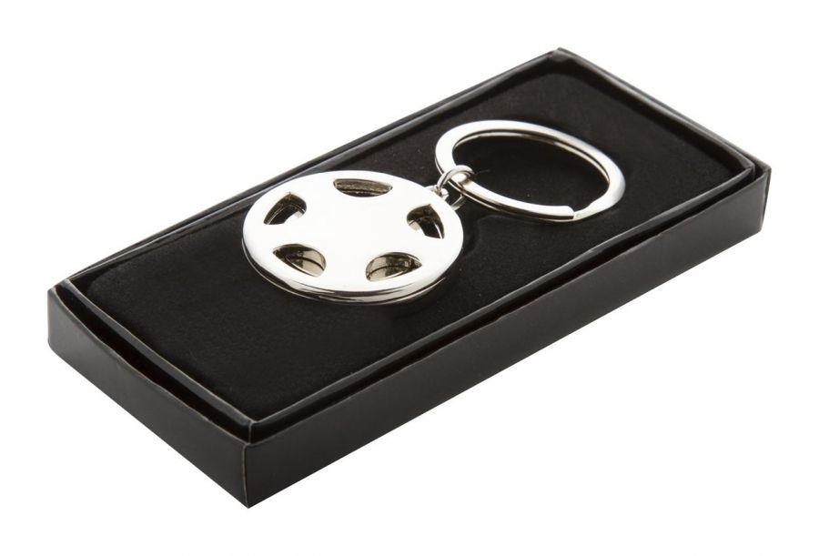Brelok o kształcie felgi samochodowej w czarnym opakowaniu prezentowym.