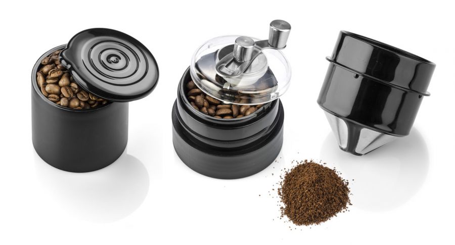 Nietypowy kubek termiczny, który skrywa w sobie funkcję młynka do kawy. Kubek COLUMBIA jest idealnym rozwiązaniem dla osób ceniących aromat świeżej, własnoręcznie zmielonej kawy. COLUMBIA wyposażony jest w schowek do przechowywania ziaren kawy, ceramiczny manualny młynek do kawy z regulacją grubości mielenia, sitko do parzenia kawy oraz kubek termiczny. Pakowany jest w eleganckie czarne pudełko. Kubek ma pojemność 360 ml, wykonany ze stali nierdzewnej o podwyższonym standardzie.