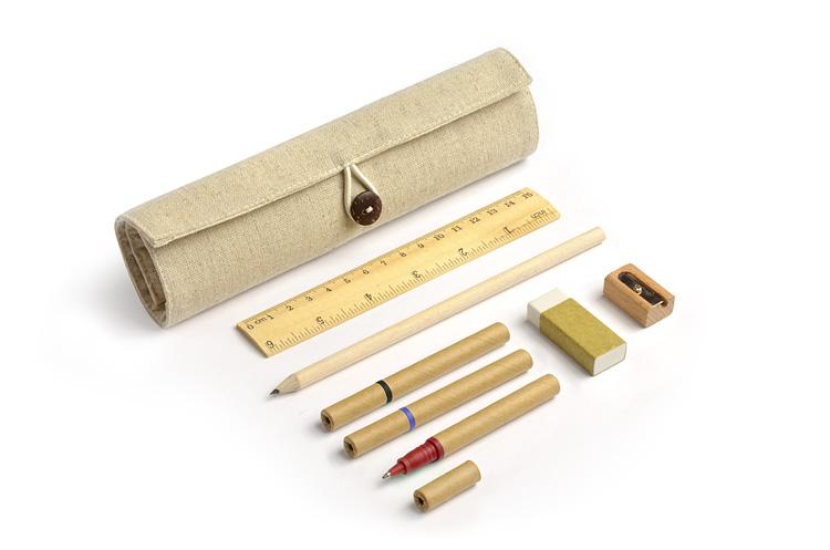 Piórnik ekologiczny wykonany z lnu. Zapinany na guziczek. W zestawie 3 ekologiczne długopisy (czarny, niebieski i czerwony), ołówek, temperówka, gumka do mazania, linijka. Logo wykonamy metodą nadruku.