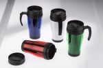 Klasyczny kubek termiczny o pojemności 400 ml wykonany w całości z tworzywa. Kubek posiada podwójne ścianki oraz wygodny uchwyt pomagający w transporcie. Utrzymuje temperaturę do 3 h. Przesuwane zamknięcie najlepiej sprawdza sie przy transporcie w pozycji pionowej. Znakowanie możliwe na korpusie.