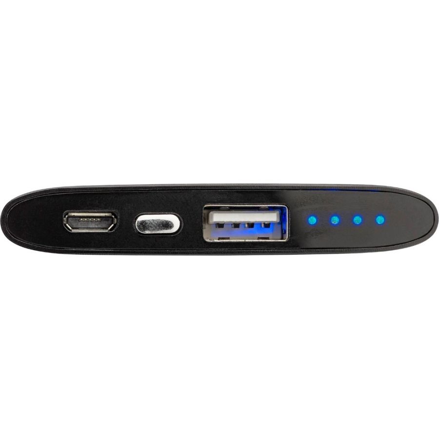 Power bank 5000mAh, wejście DC5V, 1.5A (max) i wyjście DS5V, 1.6A, 5 niebieskich diod LED wskazujących poziom naładowania, wejście USB i micro USB, 1 kabel USB/micro USB