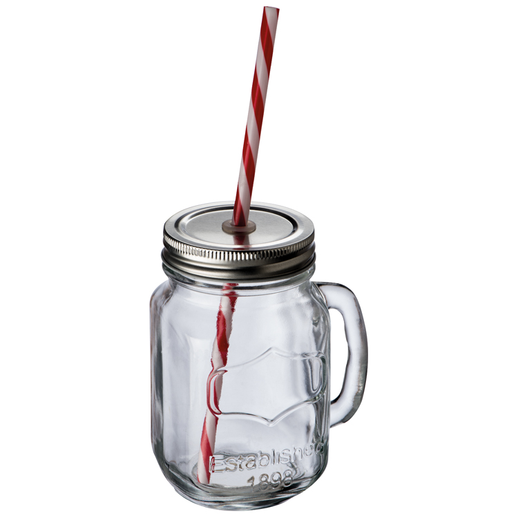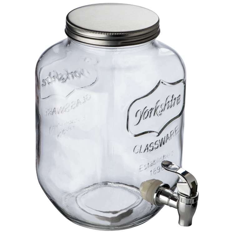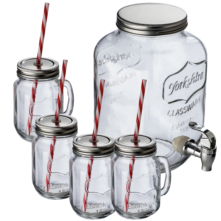 Dozownik do napojów (poj. 4000 ml.) w zestawie z czterema słoikami (poj. 450 ml.). Całość wykonana ze szkła. Logotyp można umieścić na metalowym wieczku dozownika.