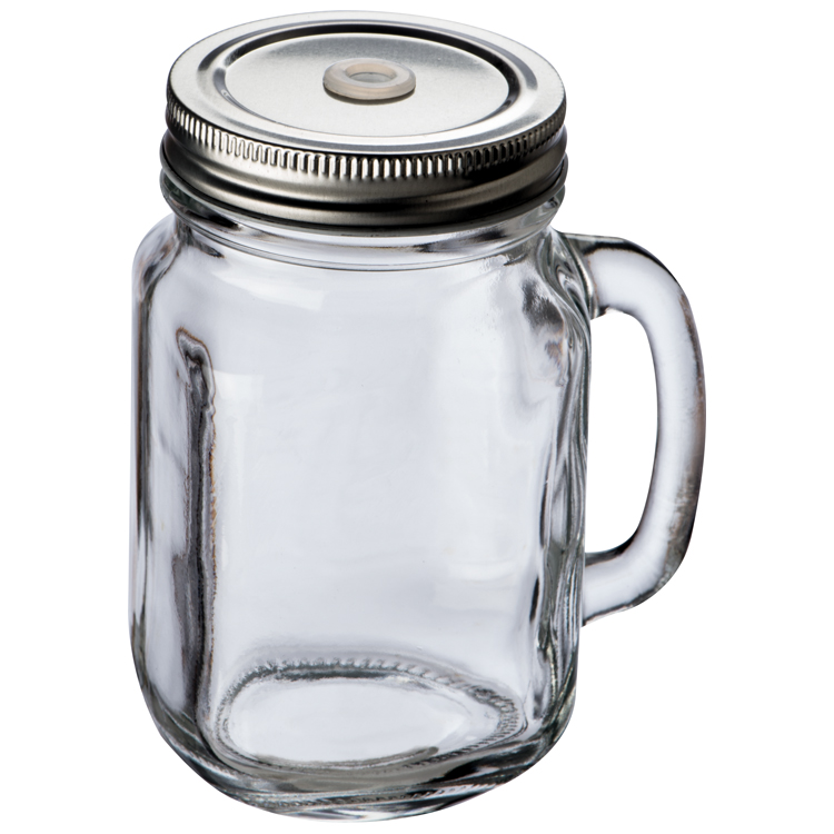 Szklany słoik do napojów, koktajli i grzańca, z metalowym wieczkiem i miejscem na słomkę, poj. 450 ml. Produkt sprzedawany bez słomki. Logotyp można umieścić na wieczku.
