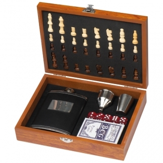 Zestaw składający się z piersiówki o pojemności 237ml, szachów, kart oraz kości do gry. Całość zapakowana w drewniane pudełko, na którym można umieścić logotyp.